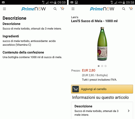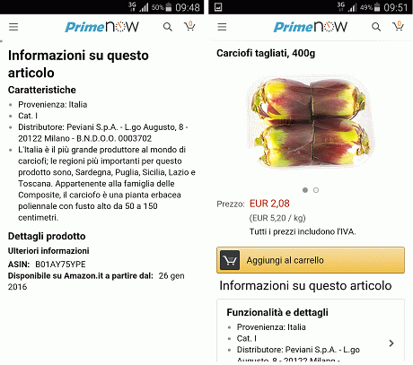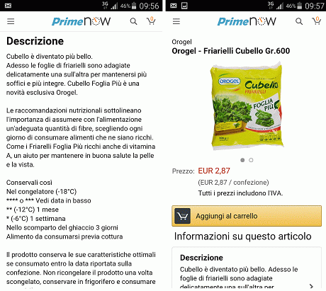 Abbiamo scaricato la app Amazon Prime Now simulando l'acquisto di prodotti del fresco o trasformato. Fra le varie referenze, ci siamo soffermati sui prodotti delle aziende Peviani, VOG Products (Leni's), Orogel surgelati.