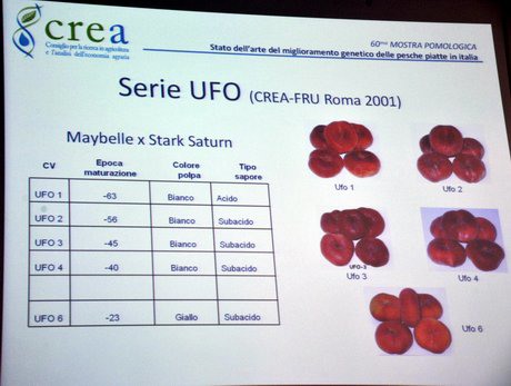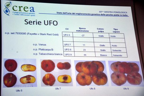 Tali caratteristiche spinsero anche l'Istituto Sperimentale di Frutticoltura di Roma ad avviare a propria volta un programma di miglioramento genetico, che migliorò ulteriormente la qualità del frutto, estendendo sensibilmente il calendario di raccolta. I ricercatori denominarono quella nuova famiglia varietale "UFO". Oggi il calendario di maturazione va, per le pesche piatte, da maggio a ottobre; più breve quello delle nettarine piatte.