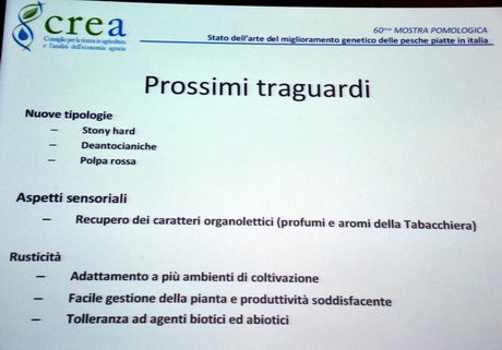 Questa la premessa generale del convegno dedicato alle pesche, in particolar modo a quelle piatte (o platicarpa che dir si voglia), organizzato sabato 23 luglio 2016 dal CREA-FRU, Centro di Ricerca per la Frutticoltura di Roma in occasione dell'annuale Mostra Pomologica, giunta quest'anno alla sua 60ma edizione.