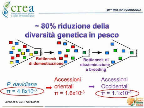 In quanto al tratto genetico responsabile della forma piatta delle pesche (e nettarine), è un connotato che si trova in un solo "locus" (S) sul cromosoma 6 del pesco. "Sappiamo dove si trova - spiega il ricercatore CREA-FRU Ignazio Verde nella relazione introduttiva - ma non è stato isolato. E' collocato tra i 315 geni di un certo tratto del DNA, ma si può cercare di 'avvicinarlo' solo mediante l'uso di marcatori molecolari, non sempre però predittivi al 100% rispetto al connotato desiderato".