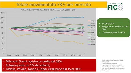 Mercati che crescono, mercati che calano e mercati che crollano. Nei giorni scorsi presso FICO a Bologna Claudio Scalise di SGMarketing ha presentato una ricerca dal titolo "Il futuro dei mercati all'ingrosso nel nuovo scenario della distribuzione europea". Un dato balza subito agli occhi, vale a dire l'andamento dal 2008 al 2017 dei principali mercati italiani. Cesena, che è una struttura medio-piccola, è cresciuta in volumi transitati del 40%; Roma e Bergamo del 10%; Rimini e Pescara sono rimasti pressoché costanti. Sul fronte negativo, Milano ha perso il 63% dei volumi; Bologna il 27%; Verona, Torino, Padova e Fondi hanno subito una diminuzione compresa fra il 15 e il 20%.