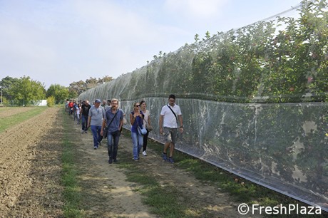 In campo, la visita si è svolta presso le aziende agricole di Davide Marconi, Claudio Alpi e Martino Benzoni. Le piante vanno allevate a fusetto con un sesto mediamente fitto sulla fila. La potatura è fondamentale per gestire la pianta in modo corretto, così come il diradamento è obbligatorio. Reti antigrandine obbligatorie e quelle anti-insetto vivamente consigliate.