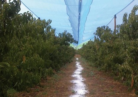 "Quindi l'impianto assume una notevole flessibilità - prosegue il tecnico - e in caso di grandinate aumenta notevolmente la pendenza totale della rete, provocando l'automatico e immediato scarico della grandine. I due teli di rete antigrandine risultano uniti in due punti: tra i rinforzi intermedi mediante un corto elastico e tra i rinforzi esterni mediante placchette rapide". Il risultato finale, guardando l'impianto frontalmente, è un triangolo avente il vertice in basso, dove tutta la grandine viene convogliata e scaricata conseguentemente a terra. E' possibile anche applicare le chiusure in testata per rendere l'impianto isolato dalla cimice asiatica.