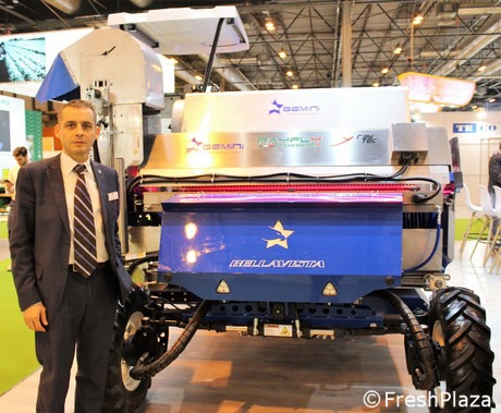 In fiera, inoltre, è stato possibile vedere Bellavista, l'esclusiva macchina progettata e prodotta da Gemini in società con Raytec Vision (cfr. FreshPlaza del 07/03/2018). "E' la prima raccoglitrice per baby-leaf al mondo dotata di selezionatrice ottica - sostiene Marcos - in grado di eliminare i corpi estranei più pericolosi direttamente nel campo. Grazie a un sistema di visione dotato di tecnologia NIR (Near InfraRed) e analisi di clorofilla è possibile infatti individuare tutti i difetti aventi dimensioni maggiori di 10 mm, scartando il 95% dei contaminanti presenti al momento stesso della raccolta".