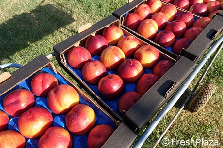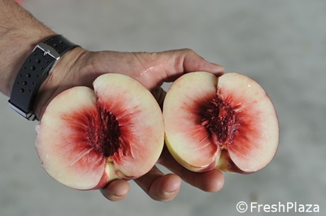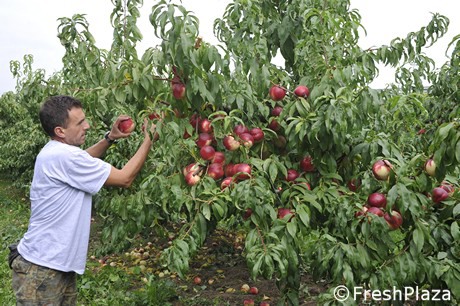 Daniele Neri mentre mostra una nettarina raccolta dopo il 20 settembre