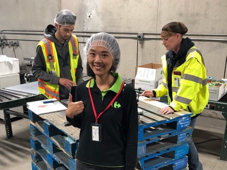 Penny presso il centro di imballaggio delle pere negli USA. Dietro di lei degli ispettori controllano le pere.
