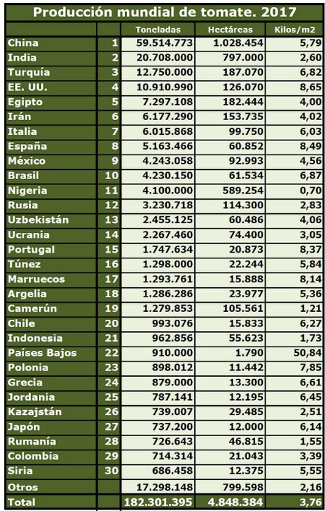 Nel 2017, la Spagna ha coltivato gli stessi volumi di pomodori del Marocco e 5,5 volte in più rispetto ai Paesi Bassi, mentre la Turchia ha coltivato il doppio della Spagna. La Cina, al primo posto come produttore mondiale, ha coltivato 11,5 volte più pomodori della Spagna. La produzione mondiale totale è stata di oltre 180 milioni di tonnellate, coltivati su una superficie di quasi 5 milioni di ettari.
