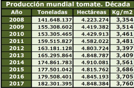 Nel 2017, la Spagna ha coltivato gli stessi volumi di pomodori del Marocco e 5,5 volte in più rispetto ai Paesi Bassi, mentre la Turchia ha coltivato il doppio della Spagna. La Cina, al primo posto come produttore mondiale, ha coltivato 11,5 volte più pomodori della Spagna. La produzione mondiale totale è stata di oltre 180 milioni di tonnellate, coltivati su una superficie di quasi 5 milioni di ettari.