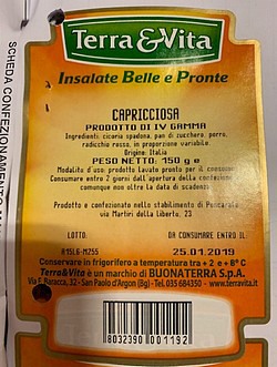 Come da comunicazione del Ministero della Salute (vedi), in data 19 gennaio 2019, è stato richiamato il lotto A15L6M255 del prodotto di IV gamma denominato Capricciosa a marchio Terra&Vita, prodotti dalla Facchini srl e distribuiti dalla Buonaterra spa.
