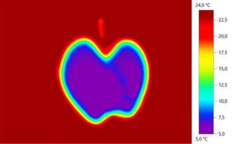 Rappresentazione termografica delle mele dopo il trattamento ad acqua calda a 55 °C che mostra un ridotto riscaldamento della polpa. Grafica: ATB