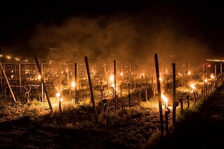 Candele speciali contro il freddo accese nei frutteti e vigneti di Jenins, nei Grigioni. (KEYSTONE/ENNIO LEANZA)