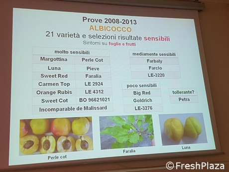 "Le prime prove sono iniziate nel 2003 - ha spiegato la ricercatrice - e, con aggiornamenti a cadenza regolare, stanno andando avanti. L'albicocco è una specie che manifesta i sintomi su foglie e frutti e presenta varietà con sensibilità molto differente l'una dall'altra".