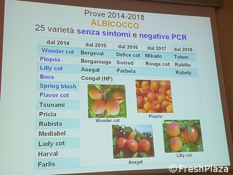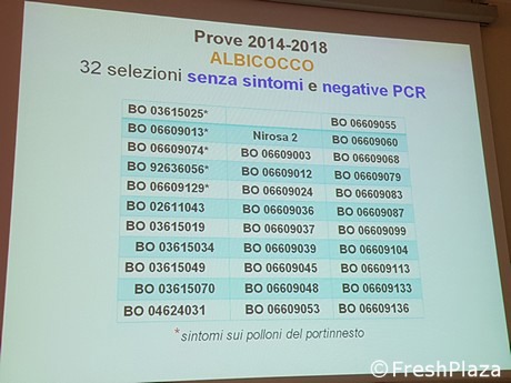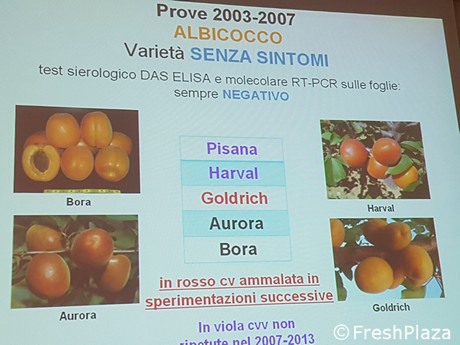Nel primo ciclo di prove, dal 2003 al 2007, risultarono sensibili al virus 12 varietà: Sylvercot, Pinkcot, Solaria, Robada, Bella D'Imola, Vitillo, Kioto, Portici, Marietta, Palummella, Bergeron, Piera. Sempre in questo ciclo, erano risultate senza sintomi Pisana, Harval, Aurora e Bora. Goldrich si è ammalata successivamente.