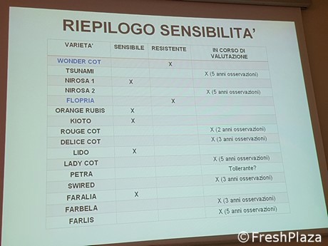 Nel ciclo 2008-2013 molto sensibili erano risultate Margottina, Perle Cot, Luna, Pieve, Sweet Red, Faralia, Carmen Top, Orange Rubis, Sweet Cot. Sempre in questo ciclo, sono state 15 le varietà e selezioni senza sintomi. Fra queste: Aurora, Wondercot, Flopria, Lilly Cot, Bora, Spring Blush, Flavor Cot, Jadore.