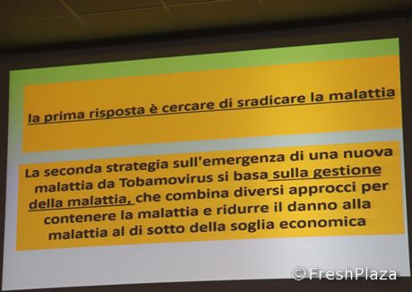 In un articolato excursus, il docente universitario si è focalizzato sulla trasmissione del ToBRFV, evidenziando le diverse modalità di contagio: "Quella più pericolosa è data dalla trasmissione meccanica, dove particolare significato assume l'azione dell'uomo e quella degli insetti impollinatori. Il virus è altamente stabile nel terreno e nel materiale vegetale di rifiuto, mentre è meno trasmissibile per seme".