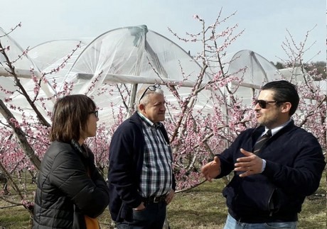 Nella foto qui sopra, da sinistra a destra: Umberto Santoni (agronomo az. Eleuteri), il fondatore Giorgio Eleuteri, Gemma Reig (Peach Tree Crop Specialist IRTA), Miquel Peris Giner (Technology Transfer and Extension Fruit Production IRTA), Marco Eleuteri e il Prof. Davide Neri. Qui sotto: Marco Eleuteri illustra ai ricercatori IRTA le peculiarità dell'ambiente di coltivazione.