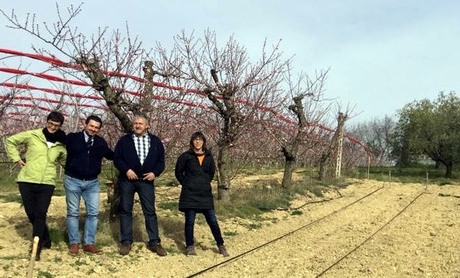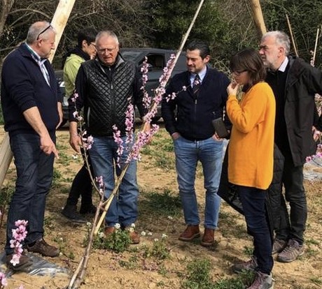 Nella foto qui sopra, da sinistra a destra: Umberto Santoni (agronomo az. Eleuteri), il fondatore Giorgio Eleuteri, Gemma Reig (Peach Tree Crop Specialist IRTA), Miquel Peris Giner (Technology Transfer and Extension Fruit Production IRTA), Marco Eleuteri e il Prof. Davide Neri. Qui sotto: Marco Eleuteri illustra ai ricercatori IRTA le peculiarità dell'ambiente di coltivazione.