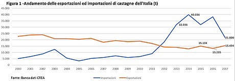 "In base ai dati Istat, dopo la ripresa dell’export di castagne e la riduzione dell’import registrati nel 2017, il 2018 si caratterizza per una nuova impennata dell’import (+67% circa) e una più contenuta flessione dell’export (-8,7%). I principali paesi fornitori sono stati, nell'ordine: Portogallo (29,5%), Spagna (22%) e Turchia (22%). Segue, a distanza, la Grecia con il 12,6% delle castagne esportate in Italia". Così a FreshPlaza Tatiana Castellotti, ricercatrice CREA - Centro di ricerca Politiche e Bio-economia.