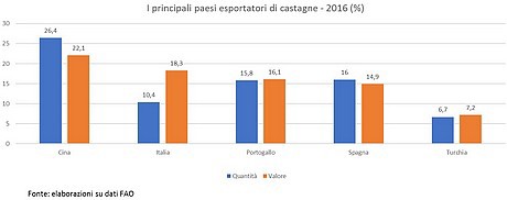 In Campania e Piemonte si concentrano alcuni tra i più importanti operatori della filiera castanicola italiana ed europea. Queste due Regioni sono le uniche a esportare sia prodotto fresco sia trasformato. Secondo i dati relativi al 2016, il 40% delle quantità di castagne esportate parte dalla Campania e il 16% dal Piemonte.