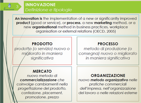 Bene rammentare, a questo punto della lettura, la definizione di innovazione adoperata dal centro studi bolognese. Si tratta di quella dell'Oecd del 2005: è l'implementazione di una nuova o significativamente migliorata produzione di beni o servizi o di un processo, un nuovo metodo di marketing o organizzativo nelle pratiche commerciali, nelle relazioni esterne o nell'organizzazione del lavoro.
