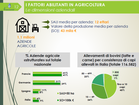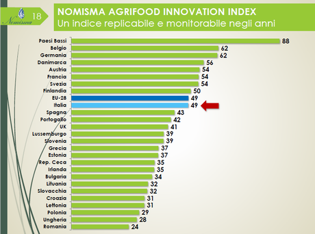 "Introdurre innovazione in azienda significa detenere competenze, limitata avversione al rischio, un orizzonte di operatività di medio-lungo periodo e risorse economiche in grado di realizzare investimenti". Tutti questi fattori risultano limitati nel tessuto agricolo italiano, ancora troppo indietro rispetto alla leadership dei Paesi Bassi con un punteggio di 88 su 100, mentre L'Italia è a 49, pari alla media europea, Germania - per dare un'idea - a 56, due punti sotto c'è la Francia e la Spagna a 43.