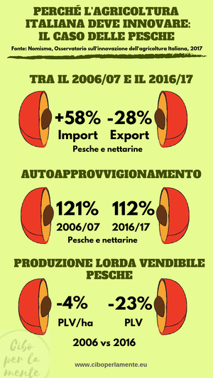 La produzione italiana di pesche e nettarine è diminuita di circa 200mila tonnellate fra 2006 e 2017. Benché l'Italia sia ancora in grado di soddisfare per il 112% il fabbisogno interno (con 1,5 milioni di tonnellate di prodotto), le superfici si sono ridotte da 101mila ettari nel 2000 a poco meno di 66mila nel 2016.