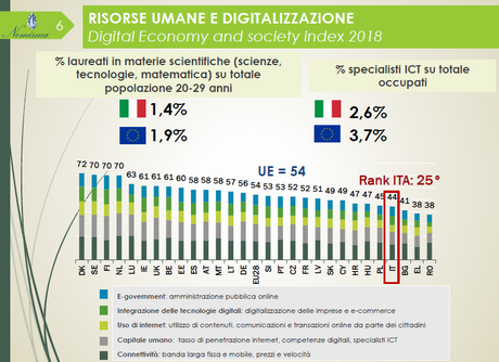 L'Italia è in coda alla graduatoria anche nella scala dell'istruzione, dato decisivo per la propensione all'innovazione, al 25° posto per numero di laureati in materie scientifiche, 1,4% mentre la media Ue è del 1,9%; 2,6% gli specialisti Ict (Information Communication Technology) quando in Europa la media è 3,7%.
