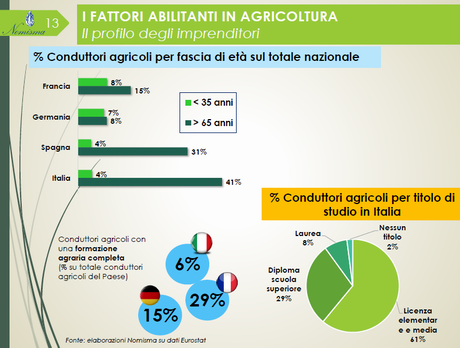 In Francia, per fare un paragone, i giovani sono il doppio dell'Italia e i conduttori anziani solo il 15%. Solo il 6% dei conduttori agricoli ha avuto una formazione agraria completa rispetto al 15% dei colleghi tedeschi e al 29% dei francesi.