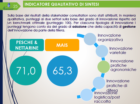 Sulla base dei risultati della consultazione degli stakeholder sono stati attribuiti, in maniera qualitativa, punteggi ai due settori (71 per le pesche e 65,3% per il mais) sulla base del grado di innovazione rispetto ad un benchmark ottimale (punteggio 100). Per ciascuna tipologia di innovazione i punteggi tengono conto sia del grado di adozione che della capacità di gestione dell'innovazione da parte della filiera.