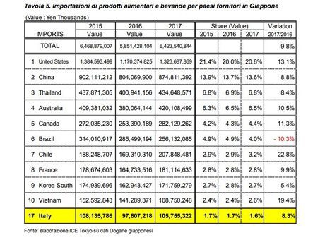 L'Italia risulta al 17° posto nella tabella dei paesi da cui il Giappone importa prodotti alimentari e bevande.