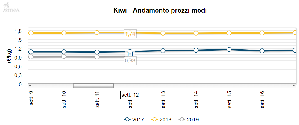 Nella 12ma settimana del 2019 (dal 18 al 24 marzo), il mercato nazionale alla produzione per il kiwi è apparso leggermente rallentato. A riferirlo è l'Ismea-Istituto di servizi per il mercato agricolo alimentare, secondo il quale gli scambi conclusi sia sul circuito interno sia sul fronte estero hanno interessato modesti quantitativi di prodotto, atti a soddisfare l'immediato fabbisogno della domanda.