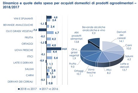 L'incremento complessivo della spesa alimentare nell'anno 2018 rispetto al 2017 si attesta di conseguenza allo +0,3% in un contesto economico caratterizzato da un ripiegamento del clima di fiducia delle famiglie e delle imprese e un peggioramento del quadro economico internazionale.