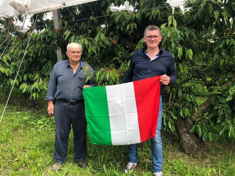 In foto: tra i primi a sostenere l'iniziativa, Alessandro Valente della Valente Pali (qui sopra in foto sulla destra). L'imprenditore si è procurato mille bandiere italiane e ne ha consegnate già ben 600 presso aziende che si avvalgono dei suoi servizi. Qui nel momento di consegnare il tricolore al produttore cerasicolo titolare dell'azienda Nino e Marisa di Quartieri Giuseppe, con sede a Vignola.