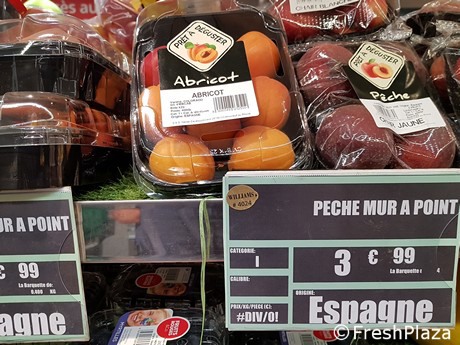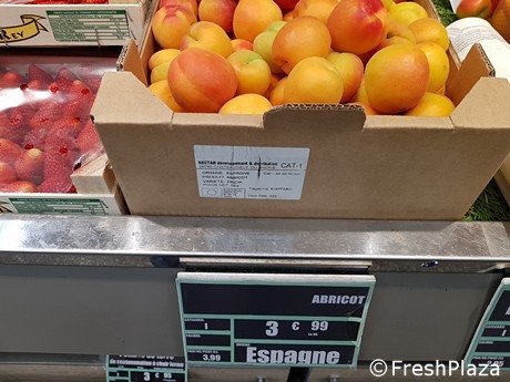 Le albicocche erano presenti in buona quantità, con provenienza equamente divisa fra Spagna e Francia. Albicocche spagnole a libero servizio, di buon calibro e aspetto erano in vendita a 3.99 euro/kg. Vi erano anche albicocche confezionate in vaschette da 6 frutti, 400 grammi totali, varietà Colorado, in questo caso a 3,99 euro la vaschetta.