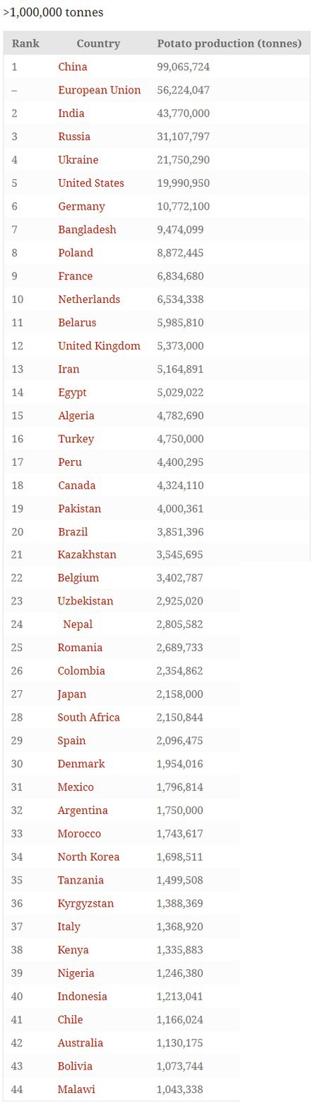 Di seguito, un elenco di paesi per produzione di patate nel 2016, basato sui dati del Food and Agriculture Organization Corporate Statistical Database.