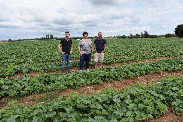 Julien Causse, Céline Mura e Bernard Moles, in un campo di meloni