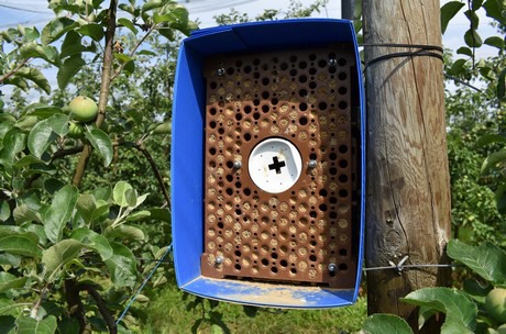 Per regolare in modo naturale i problemi legati all'invasione dei vari parassiti, i frutteti sono dotati di dispositivi per la confusione sessuale. Tra i meli, sono stati collocati nidi di pipistrelli e casette per gli insetti. "Stiamo anche pensando di introdurre dei polli nei frutteti per combattere i parassiti", aggiunge Laurent. Per quanto riguarda l'impollinazione, viene assicurata dalle api europee, allevate da un apicoltore, ma anche dalle Osmia, le famose api muratrici che trovano riparo in apposite casette poste nei lotti del frutteto.
