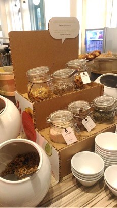 In occasione di un recente viaggio a Roma, un particolare del grande tavolo apparecchiato per la colazione a buffet in un hotel della catena Mercure cattura la mia attenzione: una serie di barattoli in vetro contenenti frutta secca e semi sono disposti in bell'ordine in un espositore in cartotecnica.