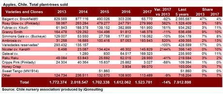 Questa sostituzione varietale emerge nelle tabelle inserite nell'annuario dell'Associazione cilena dei vivaisti (AGV). Come mostrato nella tabella successiva, i cloni migliorati e le nuove varietà come Rosy Glow, Fubrax, Ambrosia, Raku Raku, Honeycrisp e Galaval hanno progressivamente aumentato il numero di piante vendute. Al contrario, le vecchie varietà e cloni hanno fortemente ridotto le vendite.