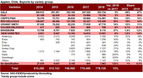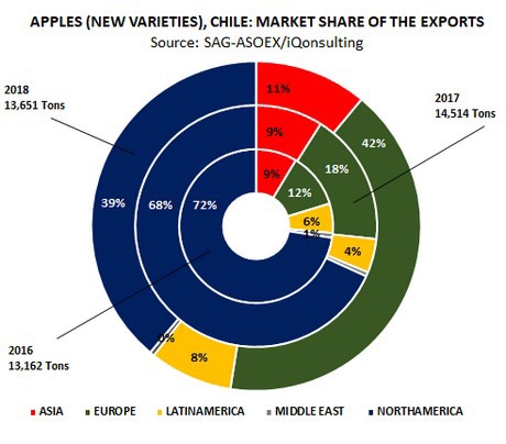 Come mostrato nella tabella seguente, le esportazioni delle nuove varietà di mele hanno avuto una costante crescita, negli ultimi cinque anni, con 13.651 tonnellate spedite nel 2018. Tuttavia, tale cifra rappresenta solo l'1,8% delle esportazioni totali cilene di mele relative a quell'anno.