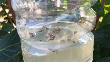 Sopra: esche alimentari attrattive proteiche. Mosche mediterranee della frutta all'interno delle trappole fai-da-te.