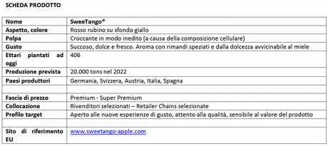 "SweeTango porterà una nuova sorprendente sensazione agli amanti delle mele, con la sua freschezza croccante già disponibile da metà agosto, prima di qualsiasi altra varietà. Grazie alle sue caratteristiche organolettiche e strutturali uniche sicuramente sorprenderà ed esalterà l'esperienza del consumatore" dichiara Jürg Burri, coordinatore di SweeTango® Europe (STEG). "Dai i test fin'ora effettuati abbiamo rilevato quanto il consumatore sappia già riconoscere e apprezzare la nuova varietà. Con SweeTango® possiamo aprire nuovi sbocchi commerciali e soprattutto offrire al cliente una nuova esperienza di gusto. A sostegno del lancio europeo stiamo mettendo a punto un importante progetto di rebranding, che presenteremo a Madrid in occasione della prossima edizione di Fruit Attraction".