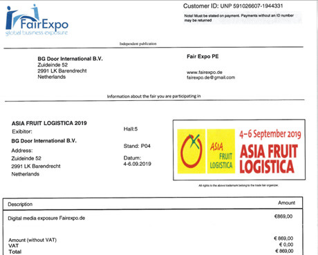 L'azienda olandese BG Door ha recentemente ricevuto una fattura da FairExpo. In teoria questo documento sarebbe stato emesso a seguito della promozione mediatica durante Asia Fruit Logistica. Attenzione, però: si tratta di una fattura falsa. Quindi non cadete nella trappola e non fatevi ingannare!