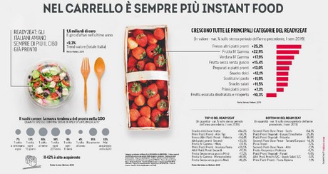 E' boom per il food delivery che è utilizzato oramai dal 26% degli italiani. E anche negli acquisti al supermercato vince l'instant food (+9,3% in un anno). In questa rivoluzione gastronomica, si perde di vista anche il concetto di "portata” e al primo o secondo piatto della tradizione si privilegiano gli snack (dolci o salati, poco importa, crescono entrambi a doppia cifra), frutta e verdura meglio se già confezionate, le barrette sostitutive dei pasti e tutto ciò che può rappresentare un piatto pronto.