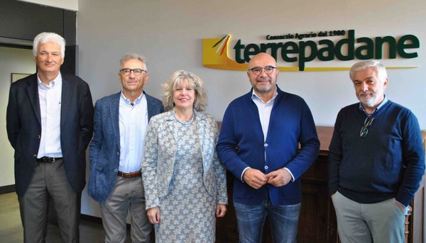 Da sinistra: Paolo Gazza (direttore OP Ainpo); Tiberio Rabboni (presidente OI); Simona Caselli (assessore regionale all'Agricoltura); Marco Crotti (presidente Consorzio agrario Terrepadane) ed Emanuele Mazzoni (docente dell'Università Cattolica del Sacro Cuore)