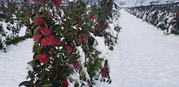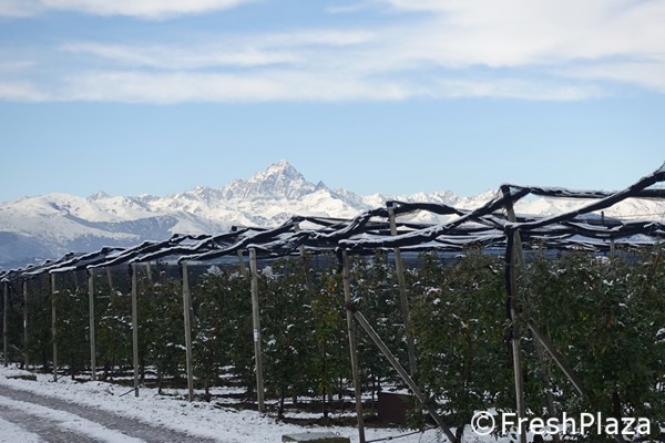 La neve era caduta sugli ultimi impianti, con i frutti ancora in pianta: quelli della varietà Crimson Snow. La suggestione della neve fra i filari, il Monviso innevato sullo sfondo e le Alpi a fare da corona rappresentano un biglietto da visita che nulla ha da invidiare ai tanti prodotti presenti sul mercato.