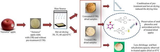 Ricercatori dell'Università di Salerno hanno valutato l'effetto sia di un nuovo pre-trattamento (che consiste nell'immersione delle mele in una soluzione contenente trealosio, cloruro di sodio e saccarosio) sia delle condizioni (temperatura e durata) in un processo di essiccazione, valutandone la cinetica e l'impatto sulle caratteristiche qualitative delle fettine di mela essiccate.