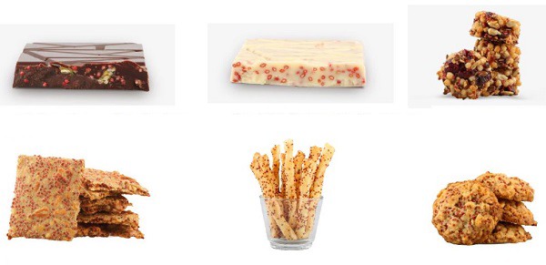 Da sinistra a destra, dall'alto al basso: tavoletta di cioccolato fondente con sesamo e semi di mirtilli rossi, tavoletta di cioccolato bianco con sesamo e semi di mirtilli rossi, cereali con mirtilli rossi e semi di mirtilli rossi, pane croccante con semi di mirtillo rosso e semi di girasole, grissini con semi di mirtillo rosso e formaggio, biscotti di avena con semi di mirtillo rosso e fiocchi d’avena