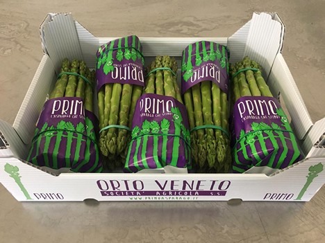 Gli asparagi precoci di Orto Veneto, da quest'anno certificati biologici, sono raccolti per un periodo di 60/70 giorni e collocati sul mercato con il marchio "Primo asparago". Sotto questo nome, Orto Veneto punta a ottenere un prodotto alto di gamma, per veri intenditori ed estimatori di questo ortaggio ricco di vitamine e sali minerali, diuretico e a basso contenuto calorico (25 kcal per 100 grammi di turione edibile).