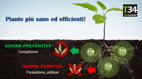 Una volta insediato nel substrato, T34 Biocontrol® contrasta i patogeni con un duplice meccanismo d'azione (azione preventiva + azione curativa). Esso inoltre interagisce con la pianta, promuovendone la crescita (effetto biostimolante).